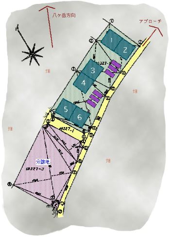 敷地は国道20号線からすぐの高台にあり、小さくまとまった畑の真ん中に土地があります。つまり農地についてはどこでも交渉により借りることが可能で、比較的利用しやすく安い土地を借地する事になります。また、農地の利用を拡大することも可能で、白州での生活の過ごし方如何では多様な展開が可能な土地です。人家からは独立していますが小さな集落の裏山にあたりますから、既存のコミュニティとの隔絶もありません。